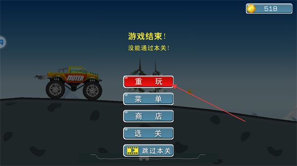 1、進(jìn)入第1關(guān),點擊屏幕右側(cè)的油門按鈕控制大腳車前進(jìn)。