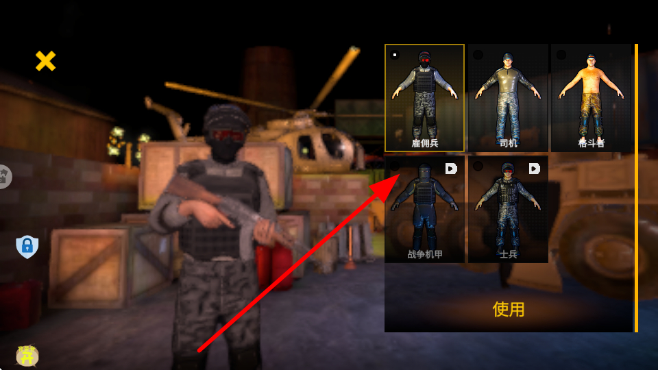 1、皮膚挑選,看到多種角色形象,如雇傭兵、司機(jī)等,點(diǎn)擊心儀的皮膚,再點(diǎn)擊使用,就能更換角色外觀,讓角色更具個(gè)性。