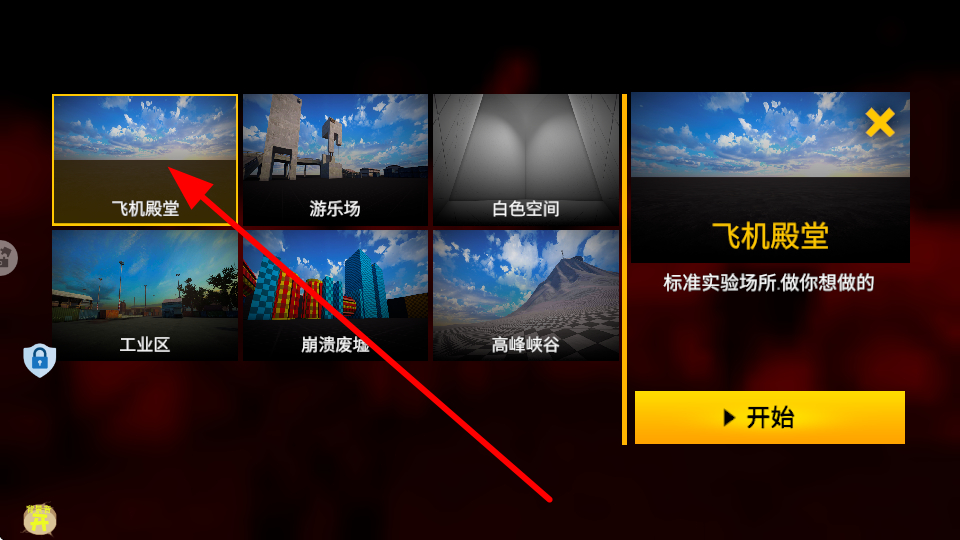 2、關(guān)卡選擇界面有飛機(jī)殿堂、游樂場等不同場景,點(diǎn)擊想要游玩的關(guān)卡,再點(diǎn)擊開始,即可進(jìn)入相應(yīng)關(guān)卡,開啟游戲挑戰(zhàn)。