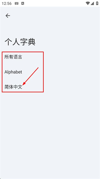 3、在個人字典語言選擇頁面,點擊簡體中文,進入簡體中文字典編輯頁面。