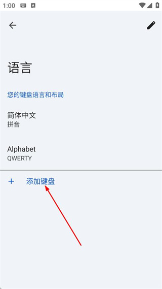 2、在語言設(shè)置頁面,點擊添加鍵盤,進入添加鍵盤頁面。