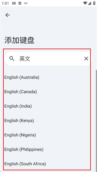 4、在搜索框中輸入英文,可查看相關(guān)英文鍵盤選項,選擇后添加英文鍵盤。