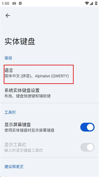 1、在實體鍵盤設(shè)置頁面,點擊語言,進入語言設(shè)置頁面。