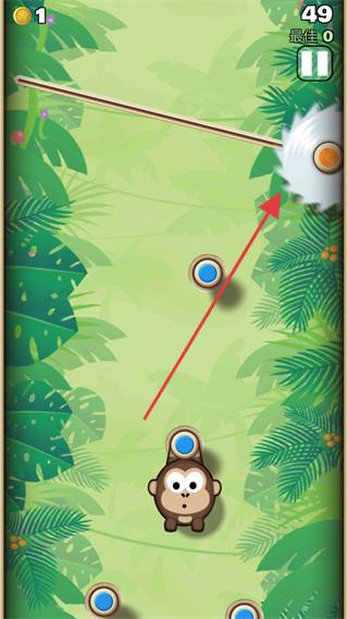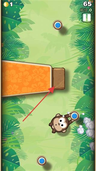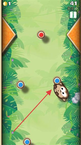 1、進(jìn)入游戲,操控小猴子移動(dòng),讓小猴子觸碰藍(lán)色圓點(diǎn),借助圓點(diǎn)反彈向上移動(dòng),避開紅色圓點(diǎn)。