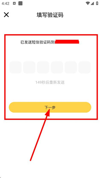 4、在填寫(xiě)驗(yàn)證碼頁(yè)面,輸入收到的驗(yàn)證碼后,點(diǎn)擊下一步,完成注冊(cè)流程。