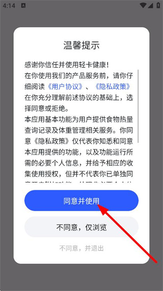 1、在溫馨提示彈窗中,點(diǎn)擊同意并使用,進(jìn)入輕卡健康主頁面。