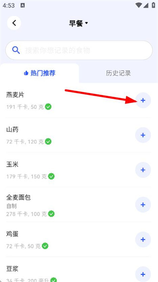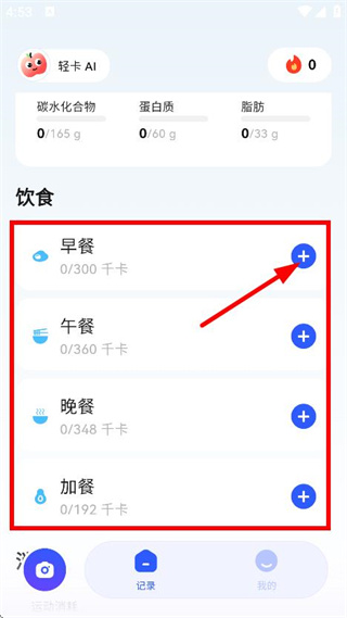 2、在頁面飲食板塊,點(diǎn)擊對應(yīng)餐食旁的+號,進(jìn)入餐食添加頁面。