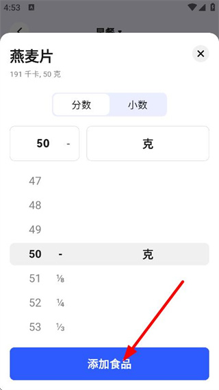 4、在食物分量設(shè)置頁面,設(shè)置好分量后,點(diǎn)擊添加食品,完成食物添加。