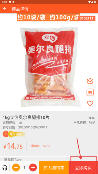 3、在商品列表中,找到1kg立信奧爾良腿排10片條目,點擊進入商品詳情頁。