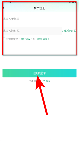 4、輸入手機號、驗證碼,勾選后,點擊注冊登錄,完成注冊。