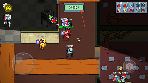 2、在限定時(shí)間內(nèi)屏幕上方綠色倒計(jì)時(shí)框顯示剩余時(shí)間,在地圖場(chǎng)景中尋找彩色方塊等目標(biāo)物品并靠近收集。