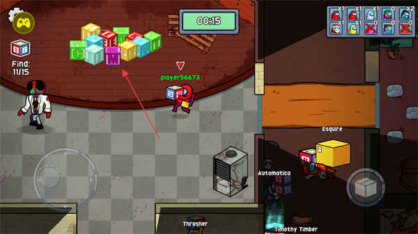 1、進(jìn)入游戲后,通過(guò)屏幕左下方的虛擬搖桿操控角色移動(dòng),注意左上角Find:11/15顯示的是需要收集的目標(biāo)物品數(shù)量進(jìn)度。