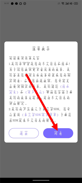 1、打開中國藥典,在溫馨提示彈窗中點擊同意。
