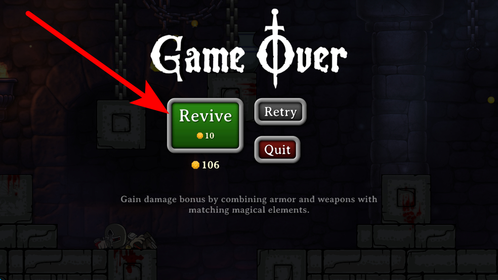 3、若角色生命值耗盡,會(huì)出現(xiàn)GameOver界面,此時(shí)可選擇Revive花費(fèi)金幣復(fù)活,繼續(xù)當(dāng)前冒險(xiǎn),也可選擇Retry重新開始或Quit退出。