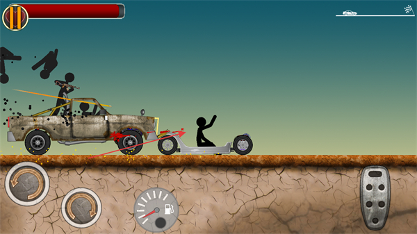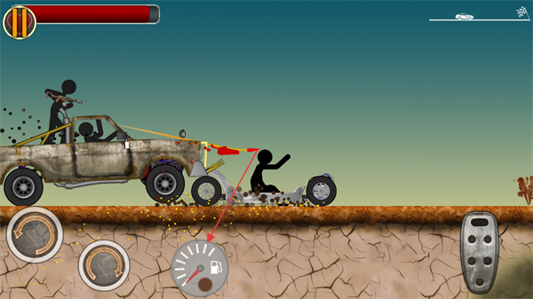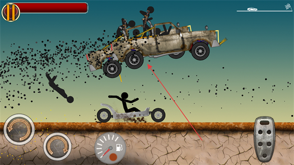 1、進(jìn)入游戲,通過(guò)屏幕左側(cè)圓形按鈕控制火柴人車輛的前進(jìn)、后退與轉(zhuǎn)向,留意上方紅色血條。