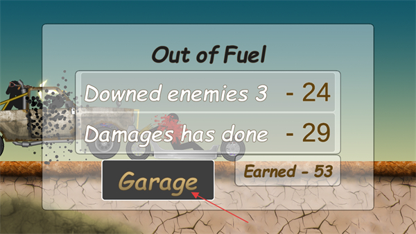 4、游戲結(jié)束出現(xiàn)OutofFuel界面后,查看擊敗敵人數(shù)量、造成傷害等數(shù)據(jù),點(diǎn)擊Garage進(jìn)入車庫(kù)進(jìn)行車輛等方面的調(diào)整。
