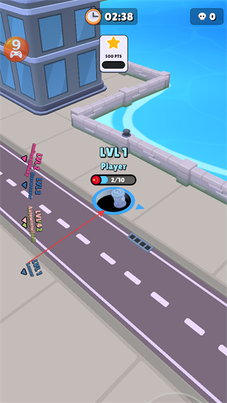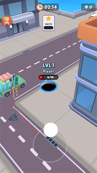 2、操控黑洞吞噬道路上的物品,像垃圾桶等,屏幕中間顯示當(dāng)前等級(jí)LVL1及吞噬進(jìn)度0/10。