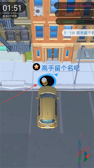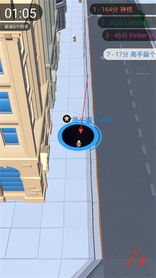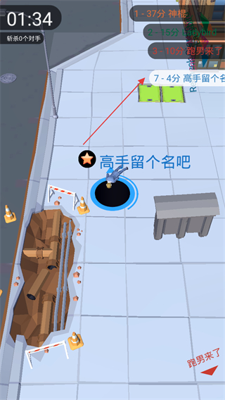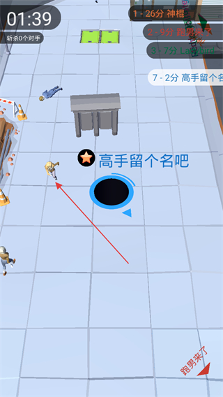2、屏幕左側(cè)顯示斬殺0個對手,去街道、廣場等區(qū)域,吞噬行人、小型障礙物,增大黑洞體積。