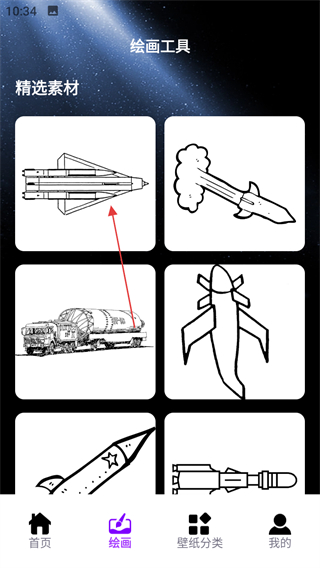 2、在繪畫工具頁面,選擇精選素材里的素材,進(jìn)入繪畫編輯頁面。