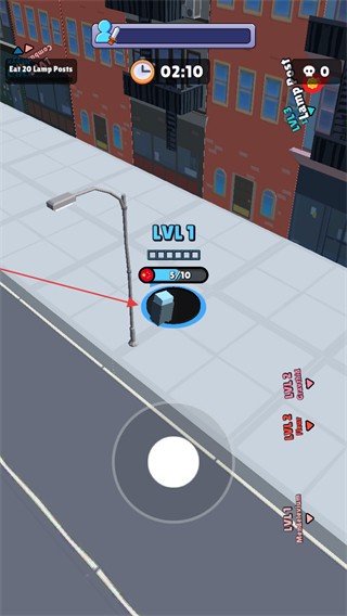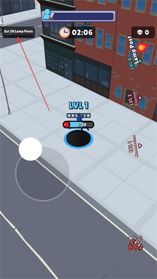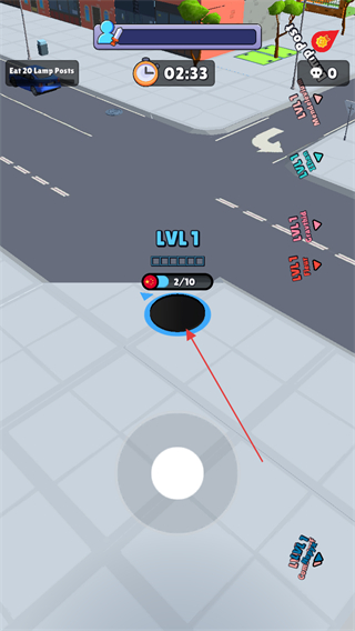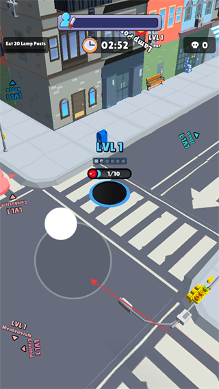 2、前期黑洞較小時(shí),優(yōu)先吞噬如交通錐、垃圾桶等小型物體,提升等級(jí),屏幕中間顯示當(dāng)前等級(jí)LVL1和吞噬進(jìn)度1/10。