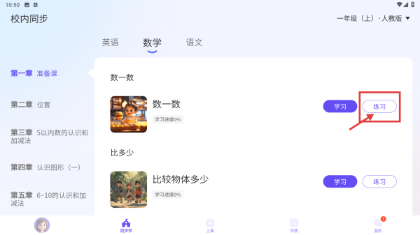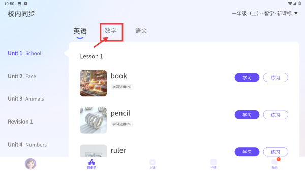 2、在校內(nèi)同步頁(yè)面,點(diǎn)擊數(shù)學(xué)科目選項(xiàng),切換到數(shù)學(xué)學(xué)習(xí)板塊。