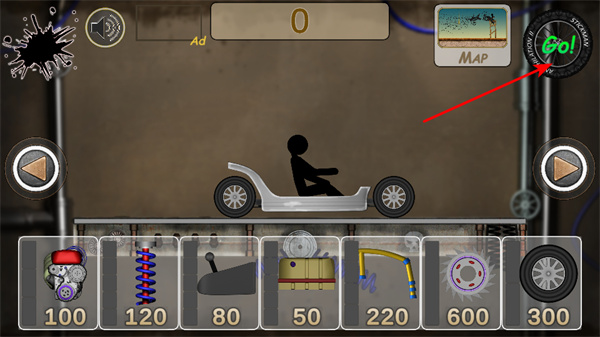 1、啟動游戲,點擊界面右上角的Go按鈕,進入火柴人駕車的破壞挑戰(zhàn)環(huán)節(jié)。