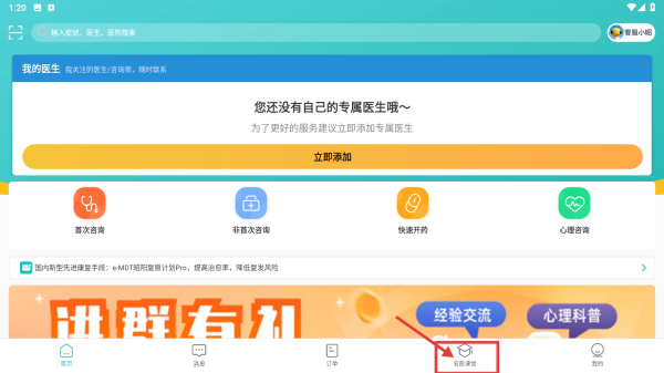 1、打開(kāi)醫(yī)療健康類(lèi)應(yīng)用,點(diǎn)擊底部名醫(yī)課堂選項(xiàng),進(jìn)入名醫(yī)課堂頁(yè)面。