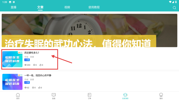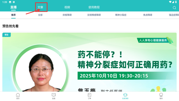 2、在名醫(yī)課堂頁(yè)面,點(diǎn)擊文章分類(lèi)標(biāo)簽,切換到科普文章列表。