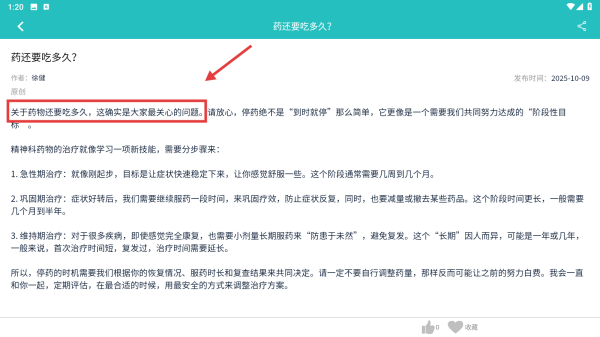 4、在文章詳情頁(yè),查看關(guān)于精神藥物服用時(shí)長(zhǎng)的專(zhuān)業(yè)解讀,三個(gè)階段說(shuō)明。