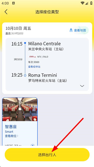 3、在選擇座位類型頁面,點(diǎn)擊選擇出行人,進(jìn)入填寫出行人頁面。