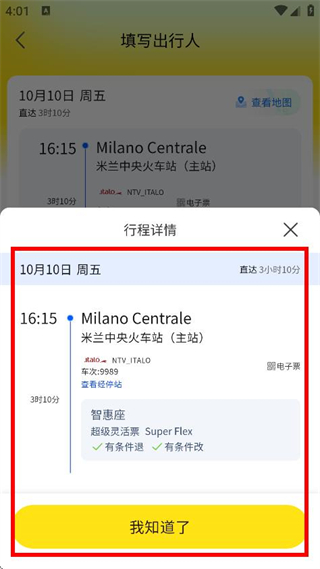 4、在填寫出行人頁面,查看行程詳情后,點(diǎn)擊我知道了,完成后續(xù)操作。