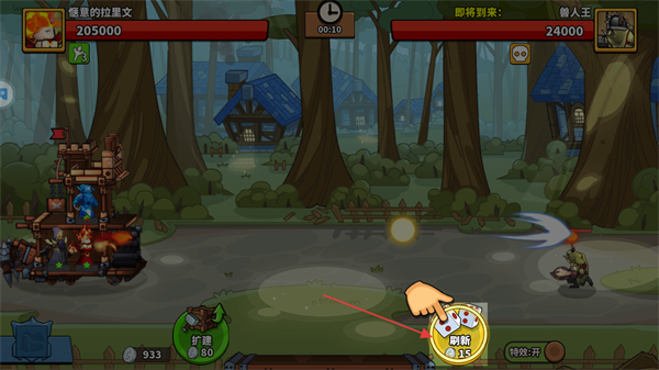 4、點(diǎn)擊刷新按鈕,消耗資源,如10、15,來更換或獲取新的精靈卡牌,合理調(diào)整防御策略,爭取贏得戰(zhàn)斗勝利。