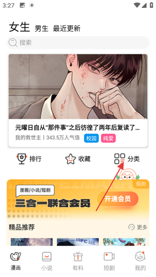1、進入軟件漫畫頁面,點擊分類,進入分類頁面。
