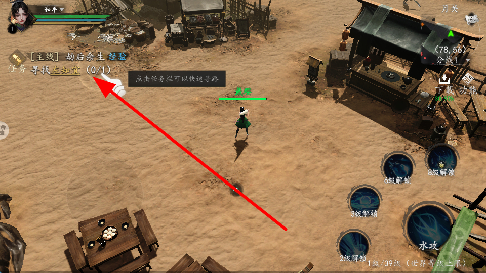 2、跟隨主線任務(wù),點(diǎn)擊任務(wù)欄,能快速尋路,按照任務(wù)指引前往指定地點(diǎn),獲取經(jīng)驗(yàn)等獎(jiǎng)勵(lì)。