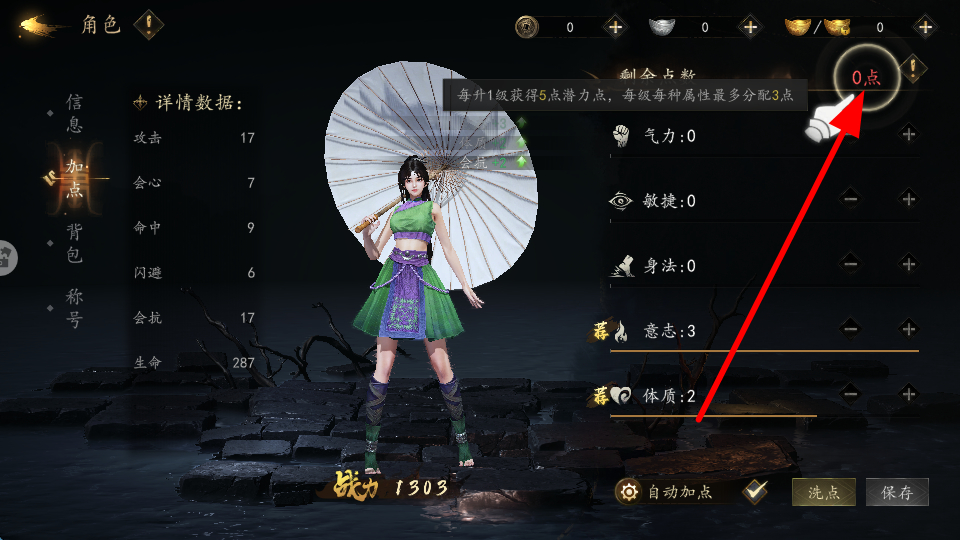 3、升級(jí)加點(diǎn)屬性時(shí),每升1級(jí)可獲得5點(diǎn)潛力點(diǎn),根據(jù)職業(yè)特點(diǎn)和戰(zhàn)斗需求,分配氣力、敏捷等屬性點(diǎn)。
