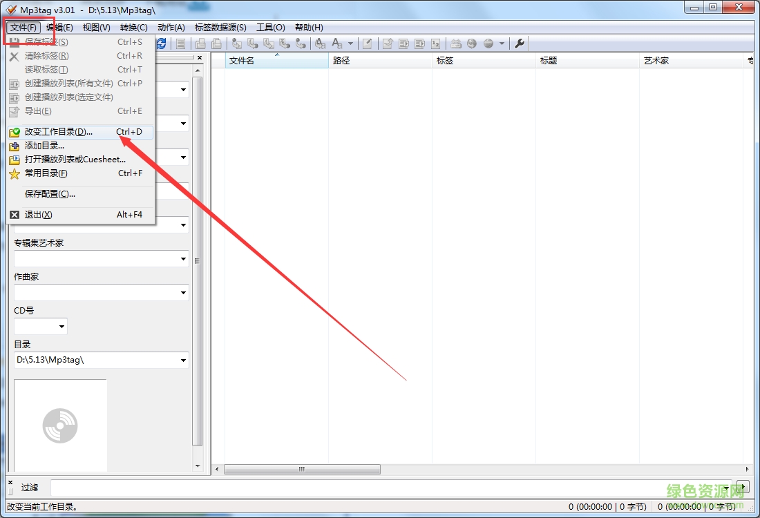 1).菜單中“文件“ - ”改變目錄“,此時會出現(xiàn)文件目錄選擇,選擇上你MP3所在的目錄。