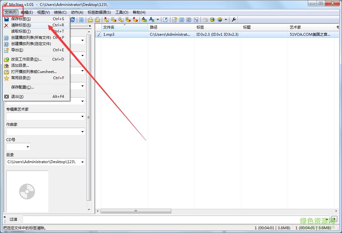 菜單中“文件“ - ”清除標簽“,則把你所選擇的MP3的標簽清除。