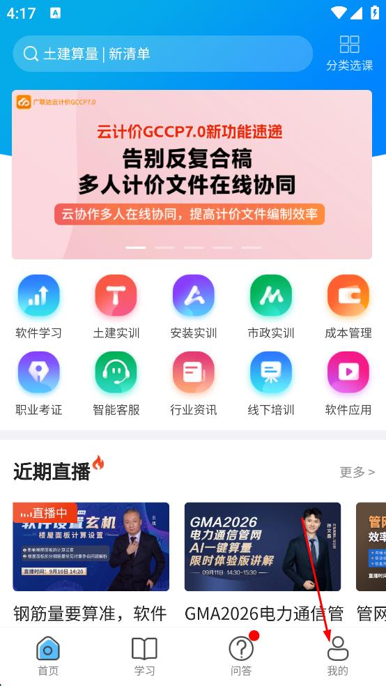 4、輸入收到的短信驗證碼,完成驗證后,即可登錄廣聯(lián)達線上服務(wù)平臺,后續(xù)可使用平臺提供的各類服務(wù),如軟件學(xué)習(xí)、土建實訓(xùn)等。