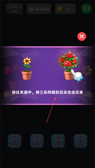 1、進(jìn)入游戲,依照提示按住花朵,將三朵相同花朵合成花束,熟悉合成操作。