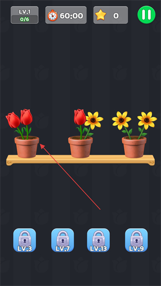 2、游戲開始,在架子上找到相同種類花朵,點(diǎn)擊拖動(dòng)進(jìn)行排列,準(zhǔn)備合成更高等級(jí)花朵。