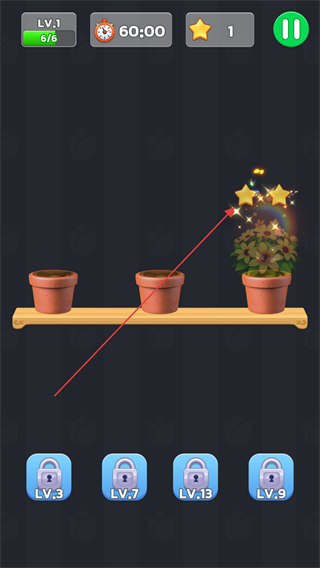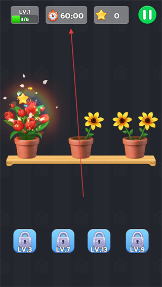 4、合成特殊或高等級(jí)花朵時(shí),會(huì)出現(xiàn)特效,同時(shí)獲得星星獎(jiǎng)勵(lì),用于解鎖下方LV.3等關(guān)卡。
