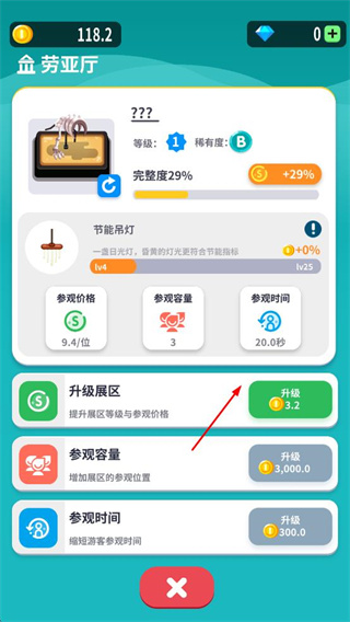 1、玩家可對博物館的展區(qū)進(jìn)行升級操作,升級展區(qū)能提升參觀價(jià)格等,還可升級參觀容量、參觀時(shí)間,同時(shí)展區(qū)有節(jié)能吊燈等設(shè)施,能在特定時(shí)段節(jié)省能耗。