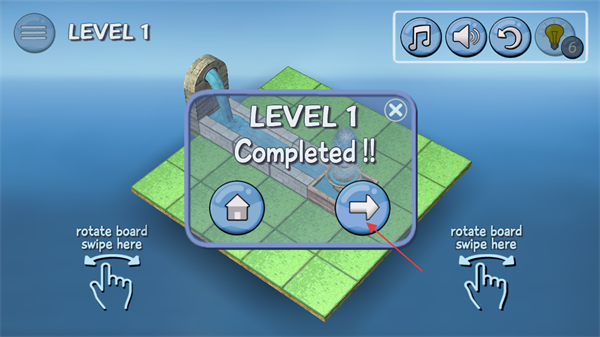 4、成功將水流引導(dǎo)至噴泉,出現(xiàn)LEVEL1Completed!提示后,點(diǎn)擊箭頭圖標(biāo)進(jìn)入下一關(guān)。