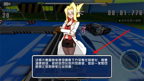 3、進(jìn)入比賽后,注意游戲中的提示,過(guò)彎時(shí)要留意車速及畫(huà)面下方平衡儀的變化,需要減速就放開(kāi)加速鍵,避免賽車飛出賽道。