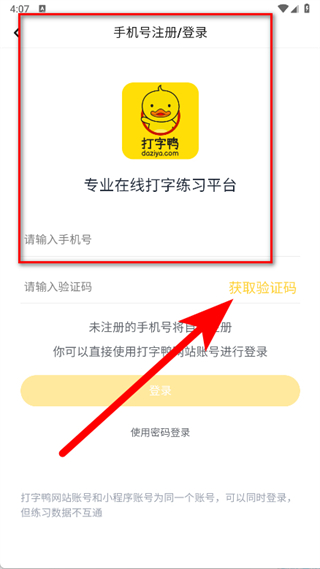 3、在手機(jī)號注冊登錄頁面輸入手機(jī)號,點(diǎn)擊獲取驗(yàn)證碼。