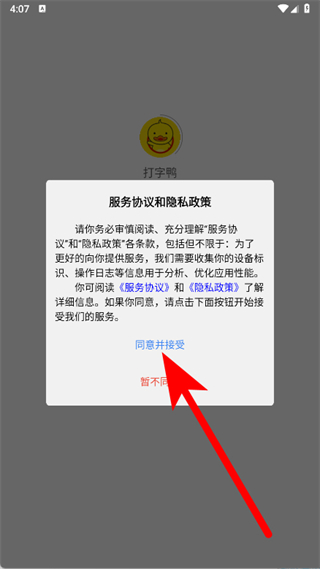1、打開打字鴨APP,在彈窗中點(diǎn)擊同意并接受。