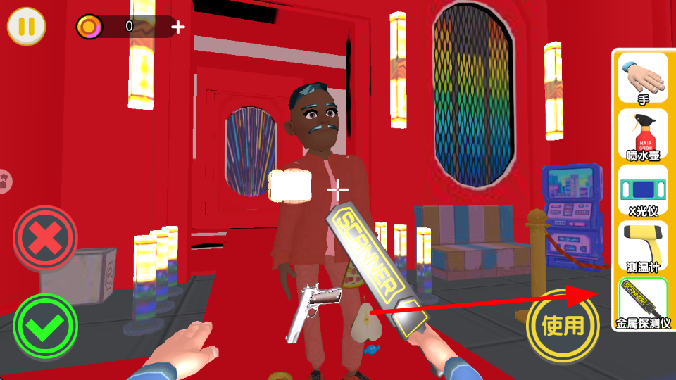 2、切換到金屬探測(cè)儀工具,點(diǎn)擊使用,對(duì)人物進(jìn)行金屬探測(cè),排查是否有金屬類違禁物品。