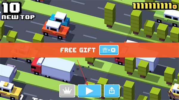 4、達(dá)到一定分?jǐn)?shù)如10分,出現(xiàn)FREEGIFT提示時(shí),點(diǎn)擊下方播放按鈕圖標(biāo),可選擇獲取獎(jiǎng)勵(lì)或繼續(xù)游戲。