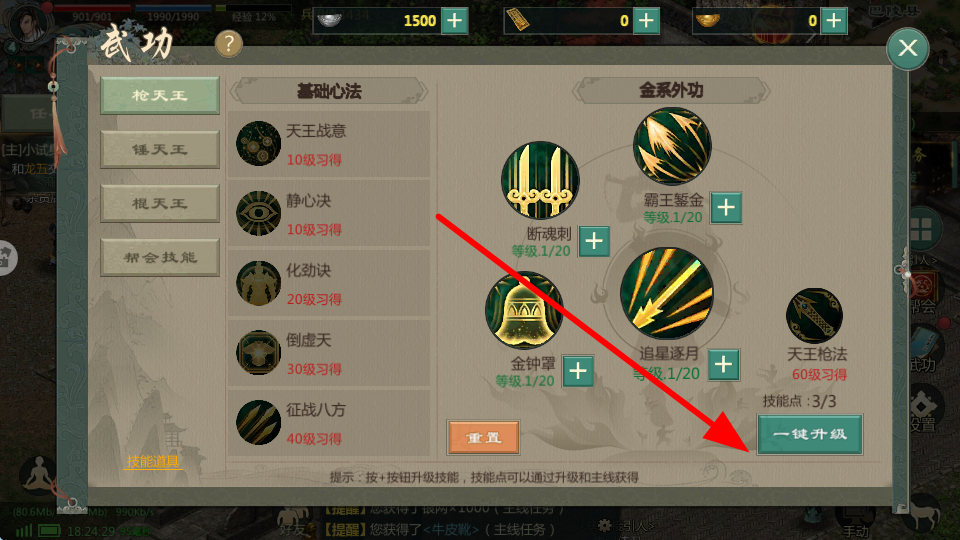 3、進(jìn)入功法界面,在不同功法,如槍天王等流派的功法間進(jìn)行切換,還能對功法進(jìn)行一鍵升級。