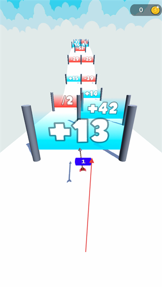1、游戲開始,操控角色前進,通過選擇賽道上帶有+XX數(shù)字的標識牌,增加箭的數(shù)量。